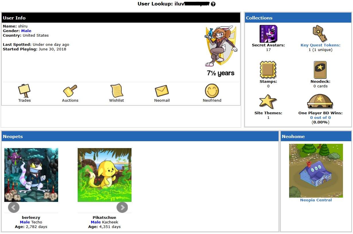 Unfortunately, I did not have any NeoFriends on my account (I still don't have any, if you want to be my NeoFriend send me a DM on instagram and I'll send you my username. The reason I have my username censored on here is because it has the name of my 5th grade crush in it... It's just super embarrasing, I don't know why I decided to make my name on neopets "I Luv [insert girl I liked]". I was a weird kid. Actually, I'm still weird now. W'ever.) and I did not spend any Neocash, so I couldn't provide any of the information I needed.