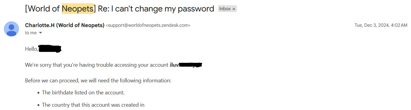This actually happened ABOUT A WEEK AGO... but I writing about it now. So, if you've heard my song i don't care anymore :(, or seen the neo/geo music video then you probably know that I got locked out of my neopets account. Basically, I forgot my password, and for the past few years whenever I would try to send an email for a password reset, it either wouldn't send or the Neopets Support Team just wouldn't be able to help me.
