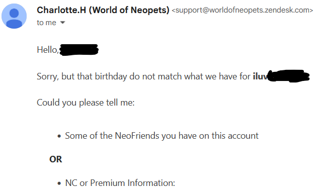 So, I told the lady what I thought the birthdate of the account was. Turns out I was wrong. My mother used to tell me to always lie about my information online, so whenever I would sign up for any website like Club Penguin, or Animal Jam, or in this case Neopets, my birthday would be completely different. Except in this case, instead of me setting my birthdate to like 1978 or something, I just made it the day I made my account... and I forgot...